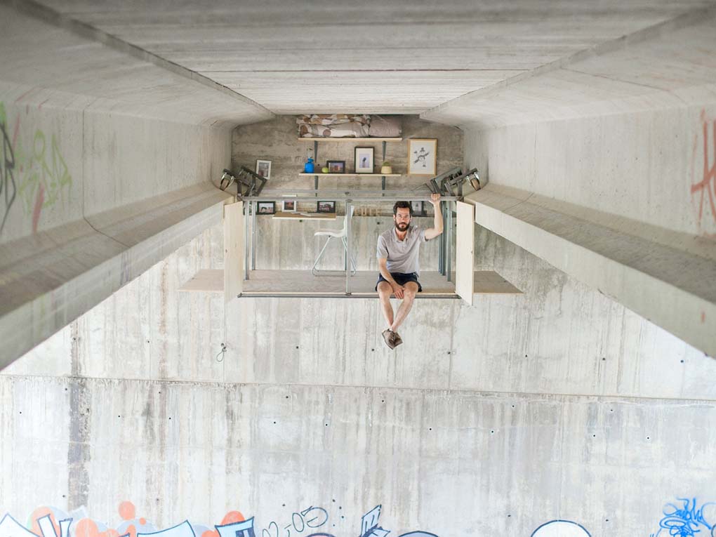 這個(gè)工作室,懸吊于天橋之下。工作室采用寄生結構,用金屬和木架?chē)晒ぷ魇铱蚣???蚣艿膬蓚妊b著(zhù)轉輪,利用天橋下的一對混泥土梁作為軌道,平時(shí)通過(guò)手搖曲柄來(lái)移動(dòng)工作室。